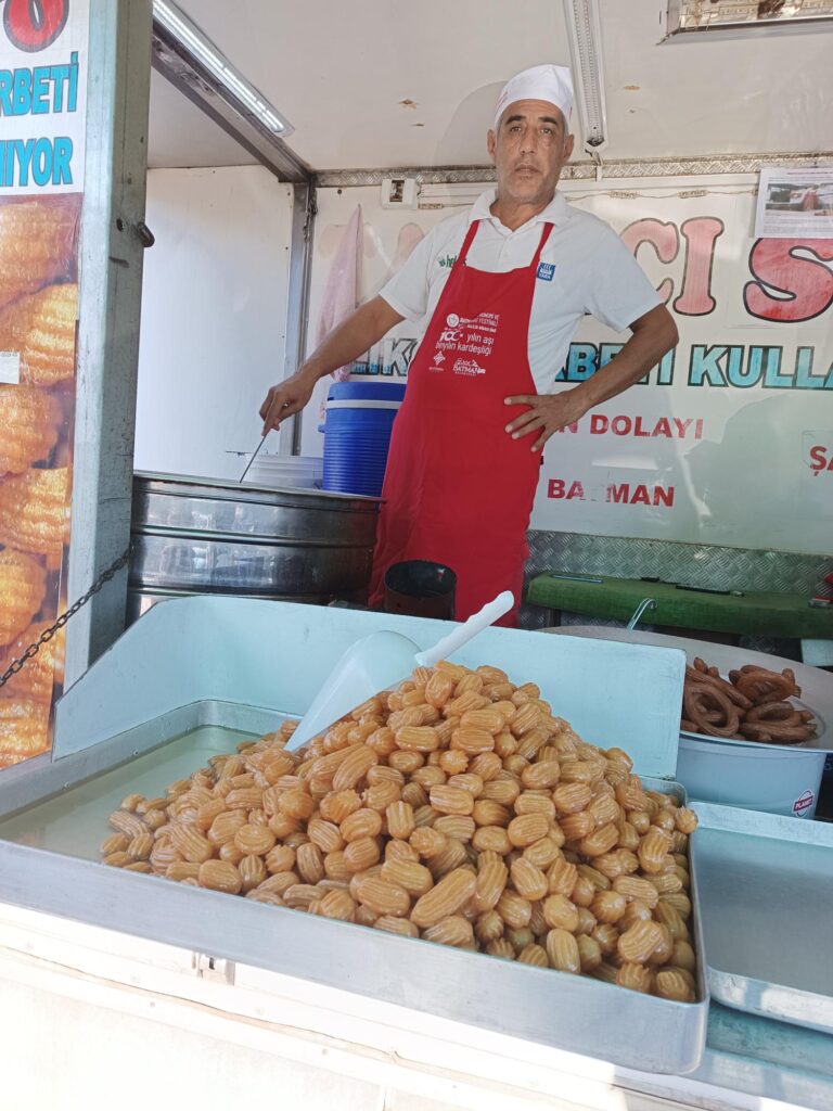 Uzun yıllardır halka ve tulumba tatlısı üreten usta Şaban Aslan, tatlılarını aracında pişirip satışa sunuyor. Aslan, tatlıcılığa küçük yaşlarda başladığını belirterek, “Uzun yıllardır bu aracın içinde hem pişirip hem satıyoruz. Tatlılarımızı tamamen doğal şeker şerbetiyle hazırlıyoruz, glikoz kullanmıyoruz” dedi.