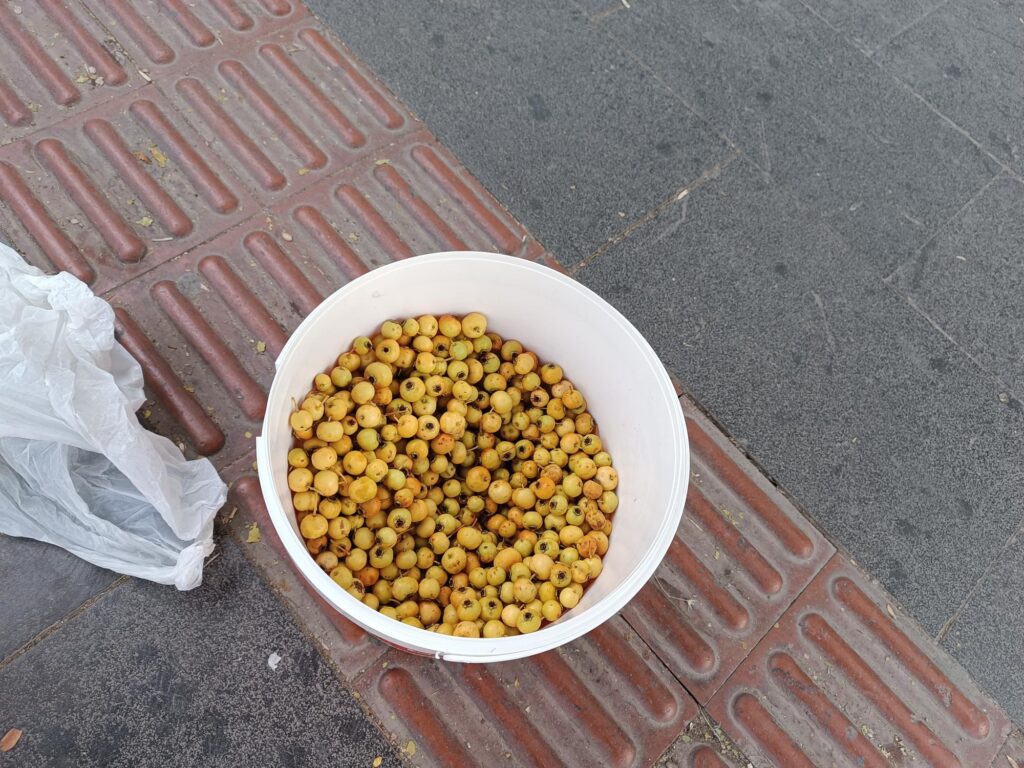 Kadın, plastik bir kovada alıçlarını sergileyerek bir ağacın dibindeki beton bankta oturuyor. Alıçların kilosu 100 lira olarak satılıyor. Geçimini bu şekilde sağlayan kadın, doğal ürünlerini şehre taşıyarak hem kendi emeğini kazanıyor hem de vatandaşlara sağlıklı ve taze alıç sunuyor.