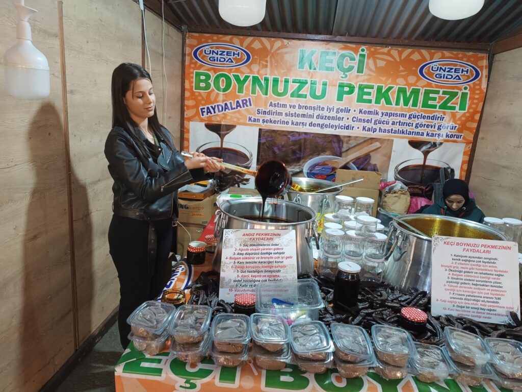 Stand görevlisi Fatma İnanç, ürünlerin tamamının %100 doğal ve katkısız olduğunu belirterek, “Mersin’den getirilen keçiboynuzu pekmezimiz, dut pekmezimiz, böğürtlen pekmezimiz, andız pekmezimiz, keçiboynuzu tozumuz ve meyvemiz var. Hepsi el yapımı, hiçbir katkı maddesi içermiyor” dedi. Mersin’den Batman’a taşınan bu doğal lezzetler, hem tat hem de şifa yönünden dikkat çekiyor. Keçiboynuzu pekmezi; astım ve bronşite iyi gelmesi, kemik yapısını güçlendirmesi, sindirim sistemini düzenlemesi ve kalp sağlığını desteklemesi gibi faydalarıyla biliniyor.
