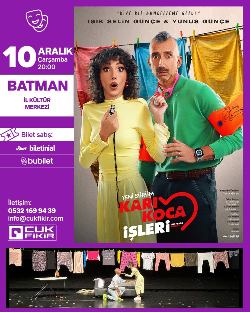 Bu nedenle Yunus Günçe’nin “Karı Koca İşleri” oyununun Batman’a gelmesi, şehirdeki sanat izleyicisi için sevindirici bir gelişme. Üstelik tek gecelik bir fırsat. Gösteri, 10 Aralık Çarşamba akşamı saat 20.00’de Batman İl Kültür Merkezi’nde sahnelenecek. İlişkileri mizahın süzgecinden geçirerek yeniden görmek, günlük hayata biraz hafiflik katmak isteyenler için kaçırılmayacak bir etkinlik.