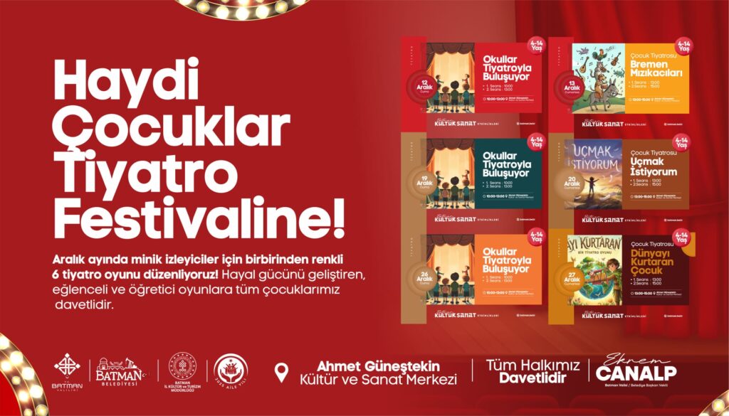 Batman Belediyesi Kültür ve Sosyal İşleri Müdürlüğü tarafından organize edilen Aralık 2025 Kültür ve Sanat Etkinlikleri, konserlerden tiyatro gösterilerine, eğitim seminerlerinden çocuk etkinliklerine kadar geniş bir yelpazede vatandaşlarla buluşuyor. Tüm etkinlikler ücretsiz olarak Ahmet Güneştekin Kültür ve Sanat Merkezinde gerçekleştirilecek.