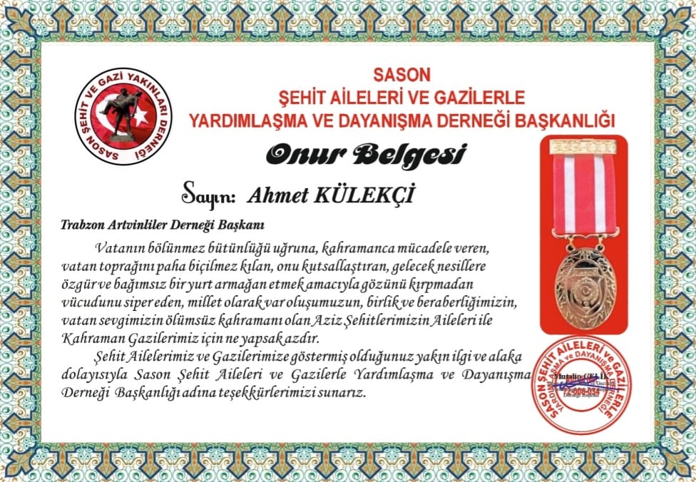 Batman Sason Şehit Aileleri ve Gazilerle Yardımlaşma ve Dayanışma Derneği, Türkiye’nin iki uç noktası olan Güneydoğu ile Karadeniz arasında kurulan gönül bağlarını güçlendiren çalışmalar nedeniyle Trabzon Artvinliler Derneği Başkanı Ahmet Külekçi’ye anlamlı bir Onur Belgesi takdim etti. Dernek Başkanı Muttalip Çelik, uzun süredir yürütülen kardeşlik projeleri, birliktelik girişimleri ve iki bölge arasında kurulan güçlü iletişim için Külekçi’ye teşekkür etti. Takdim edilen Onur Belgesinde; vatan uğruna can veren şehitlere, onur timsali gazilere verilen değerin altı çizilerek şu ifadelere yer verildi: “Vatanın bölünmez bütünlüğü için gözünü kırpmadan canını ortaya koyan aziz şehitlerimizin aileleriyle kahraman gazilerimizin hakkı ödenemez. Onlara gösterdiğiniz ilgi ve destekten ötürü derneğimiz adına şükranlarımızı sunuyoruz.”