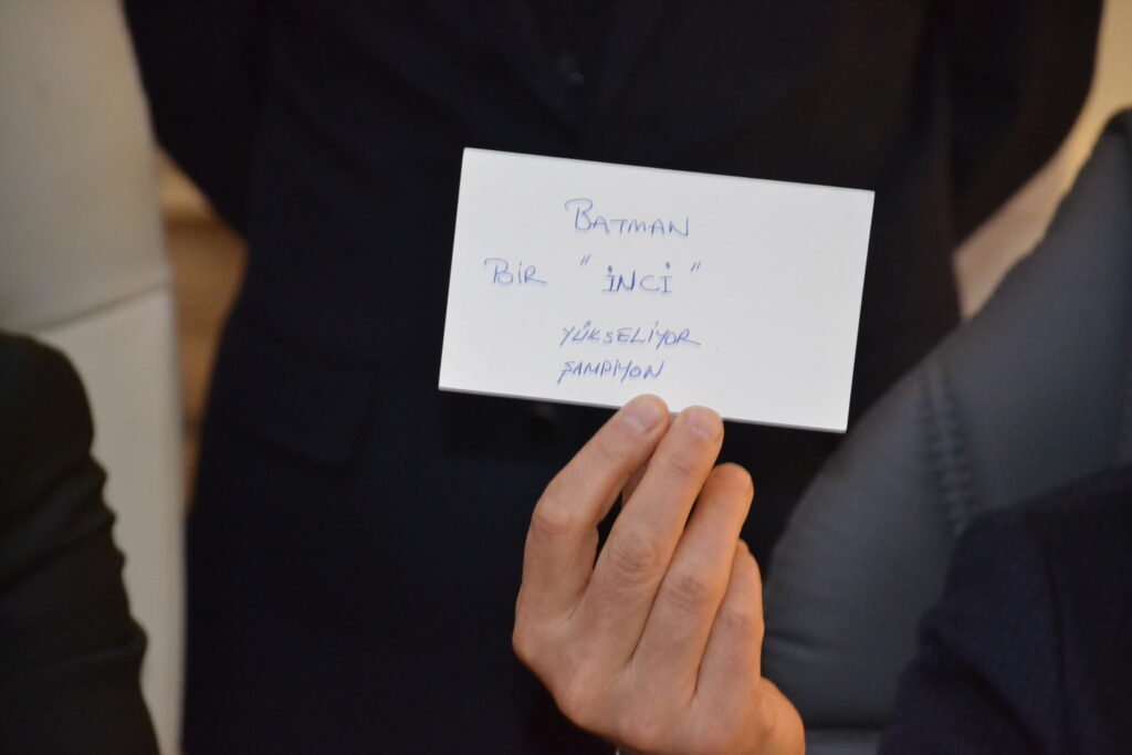 Vali Canalp’in salondan ayrılmasının hemen ardından, bu kez samimi ve tebessüm ettiren bir sahne yaşandı. AK Parti Batman Milletvekili Ferhat Nasıroğlu, masada bulunan Vali Canalp’e ait küçük bir not kağıdını gazetecilere göstererek gülümseyerek şu ifadeleri kullandı: “Alın Vali beyin notundaki başlıklar. Size hazır manşetler var notta. İstediğiniz başlığı seçerek haberimizin manşetine ekleyebilirsiniz.” Milletvekilinin gazetecilere gösterdiği notta, Vali Canalp’in konuşmasının öne çıkan başlıklarını içeren ‘Batman’, ‘Bir İnci’, ‘Yükseliyor’ ve ‘Şampiyon’ ifadeleri yer aldı.